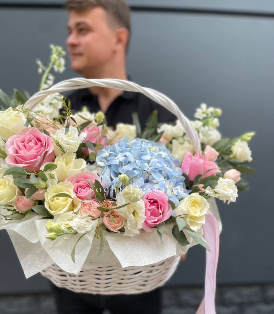 Восемь видов цветов складываются в harmonичную композицию со светлой корзиной в основе. Диантусы и эустома перекликаются с розами, а гортензия задает мягкий объем всей структуре.