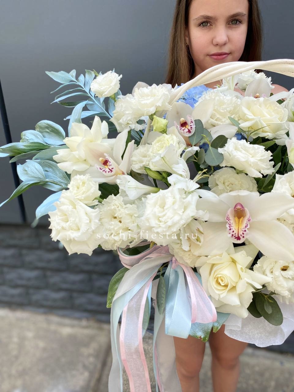 орхидея, гортензия, эустома, роза, эвкалипт, альстромерия, лента, корзина.