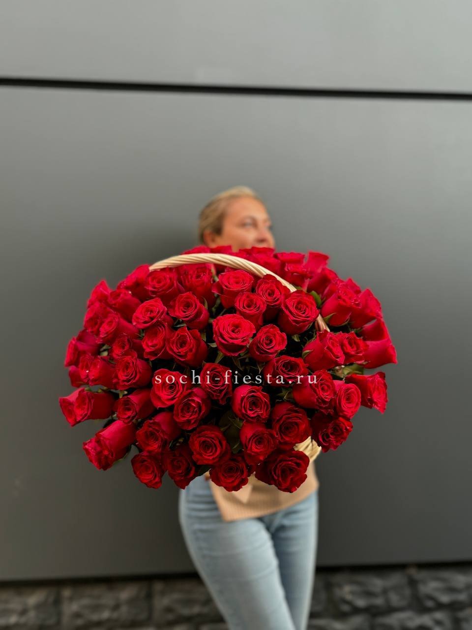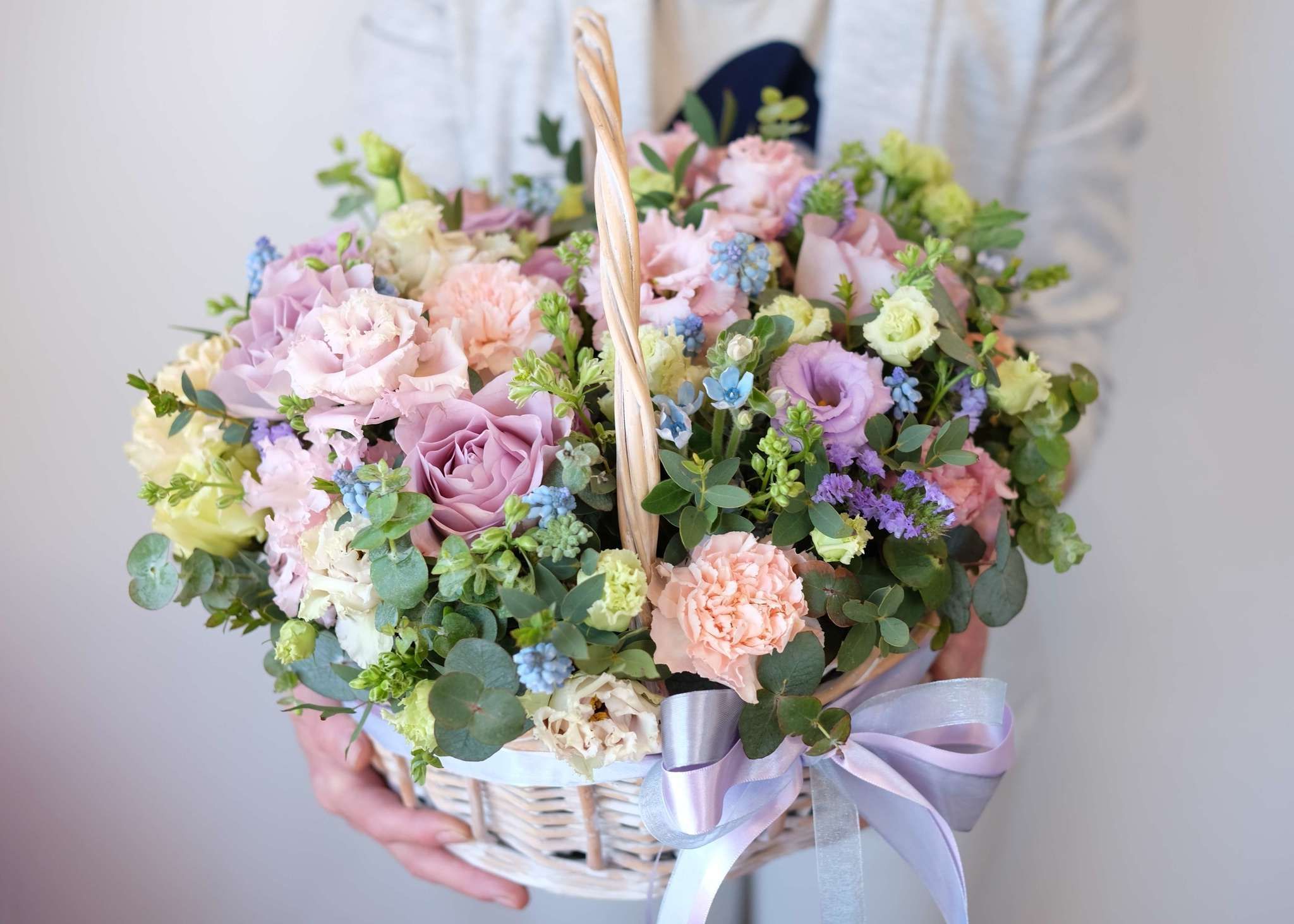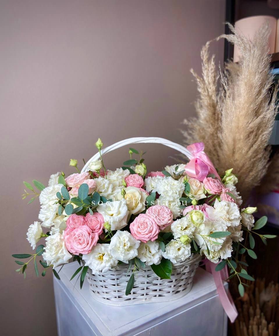 Пышная корзина с кустовыми розами и эустомой создает ощущение летнего изобилия. Диантусы добавляют воздушности между крупными бутонами, формируя объемную композицию. Готовое решение для яркого поздравления в удобной форме.