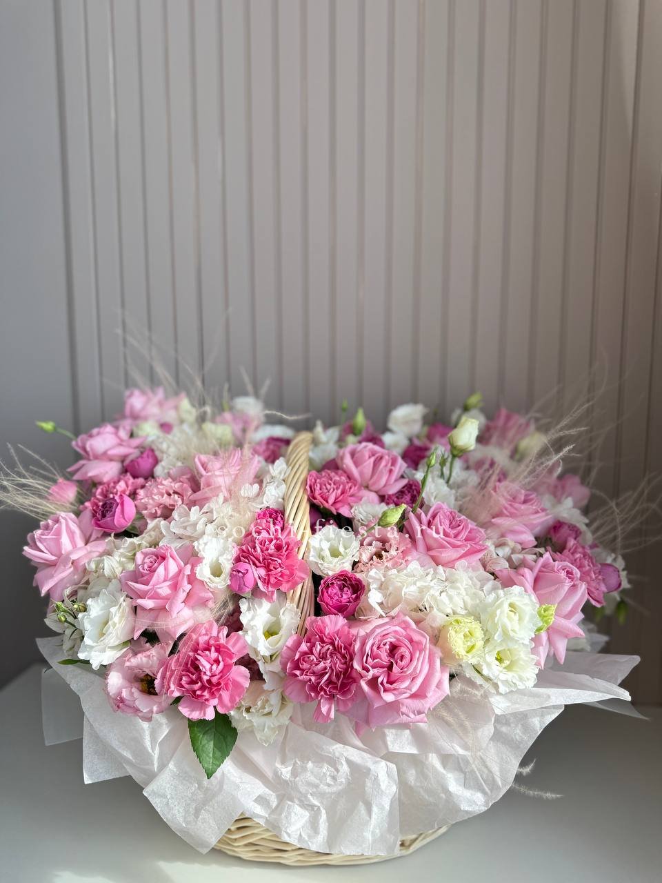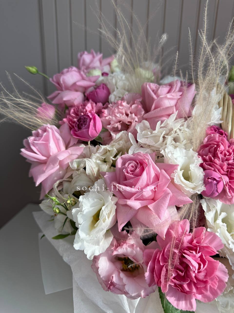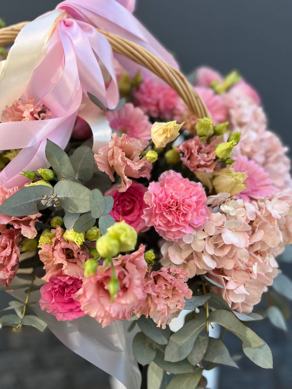 роза одноголовая, роза пионовидная, альстромерия, эустома, гортензия, ковыль, диантус, плетеная корзина.