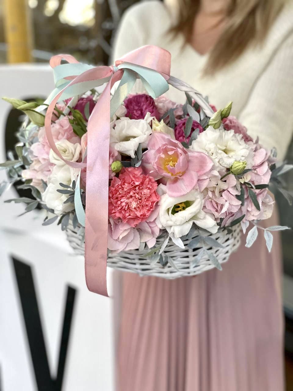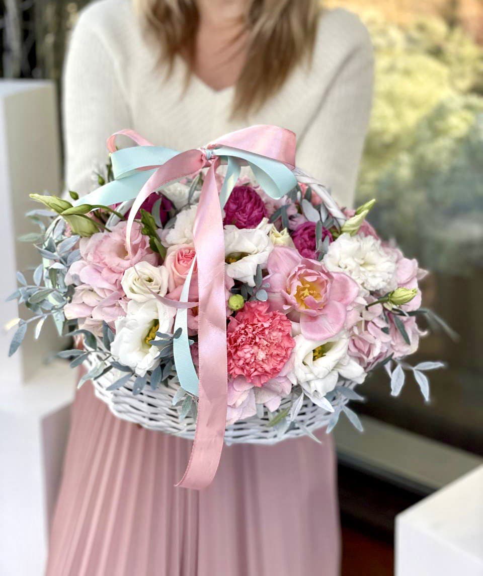 Плотная сферическая форма из пышных бутонов создаёт объёмную композицию в плетёной корзине. Ветки эвкалипта добавляют воздушности между головками цветов. Классическое решение для яркого события или знакового дня в жизни близкого человека.