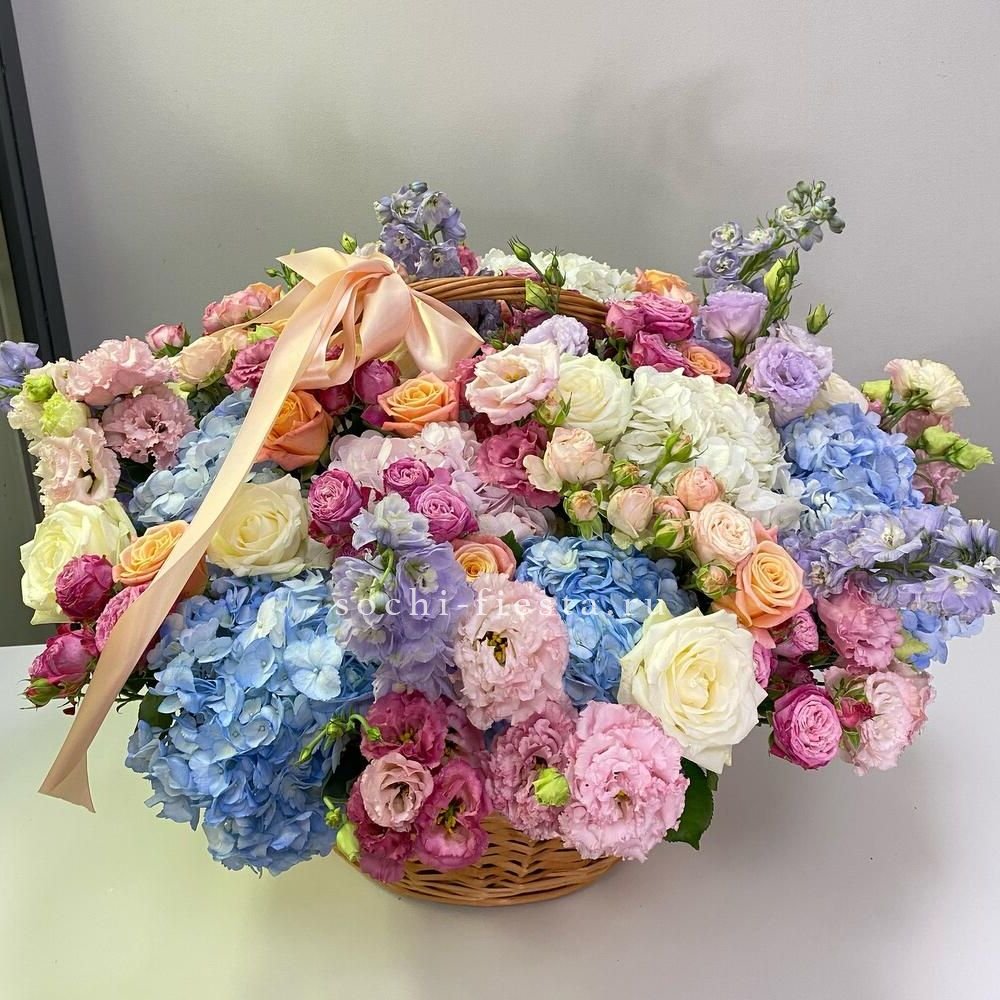 Радужный каскад из девяти видов цветов собран в плавный переход оттенков от холодных до теплых тонов. Гортензии создают объемную базу, а герберы и антирринум добавляют вертикальные акценты.