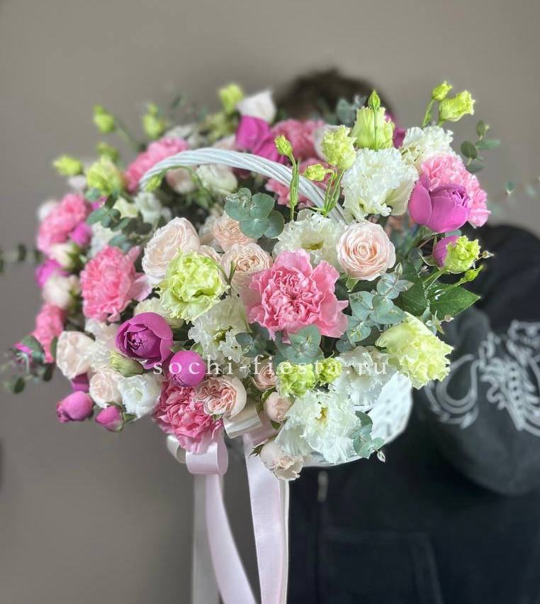 Плотная россыпь кустовых роз и эустомы создает живую текстуру с множеством мелких бутонов. Диантус добавляет воздушности, а эвкалипт собирает композицию в завершенную форму. Корзина позволяет разместить букет на столе без дополнительной вазы.