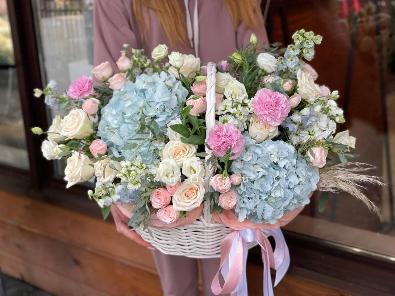 Пышная композиция в плетеной корзине объединяет розы, гортензию, эустому и дельфиниум в единую объемную форму. Маттиола и бомбастик добавляют воздушности, а эвкалипт создает мягкий природный фон. Корзина удобно располагается на любой поверхности и держит форму без дополнительной опоры.