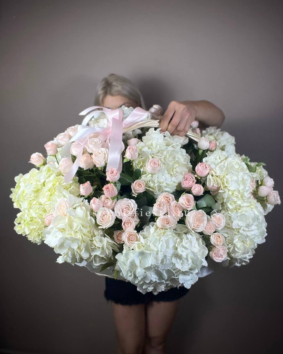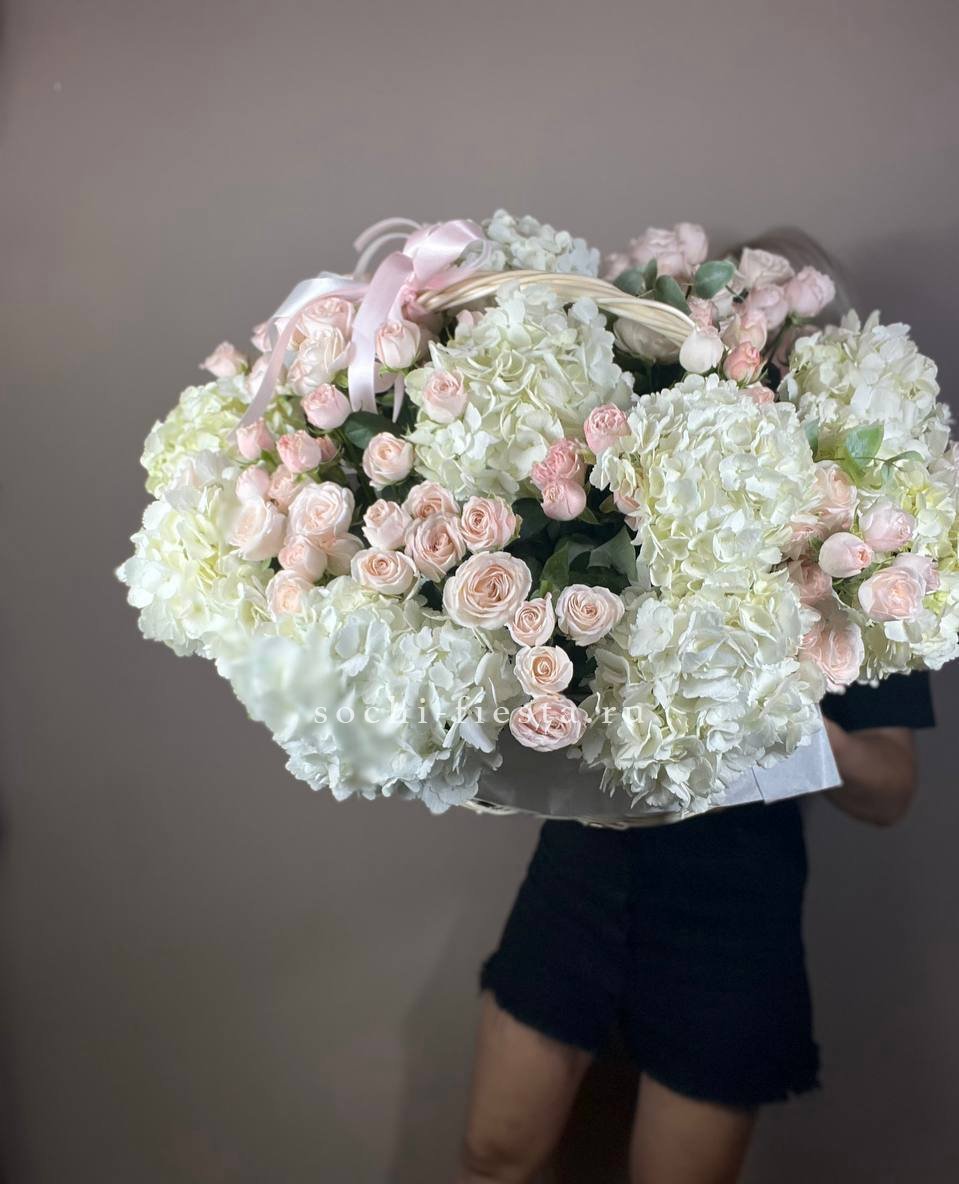 Корзина собрана плотно, каждый цветок находит своё место в общей композиции.