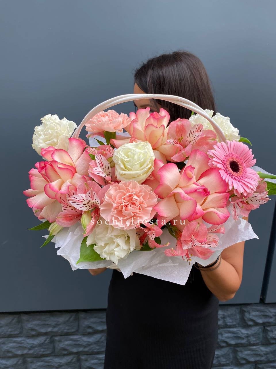 Корзина наполнена летними оттенками от персикового до кораллового. Герберы и альстромерии соседствуют с розами Джумилия в свободной природной композиции.