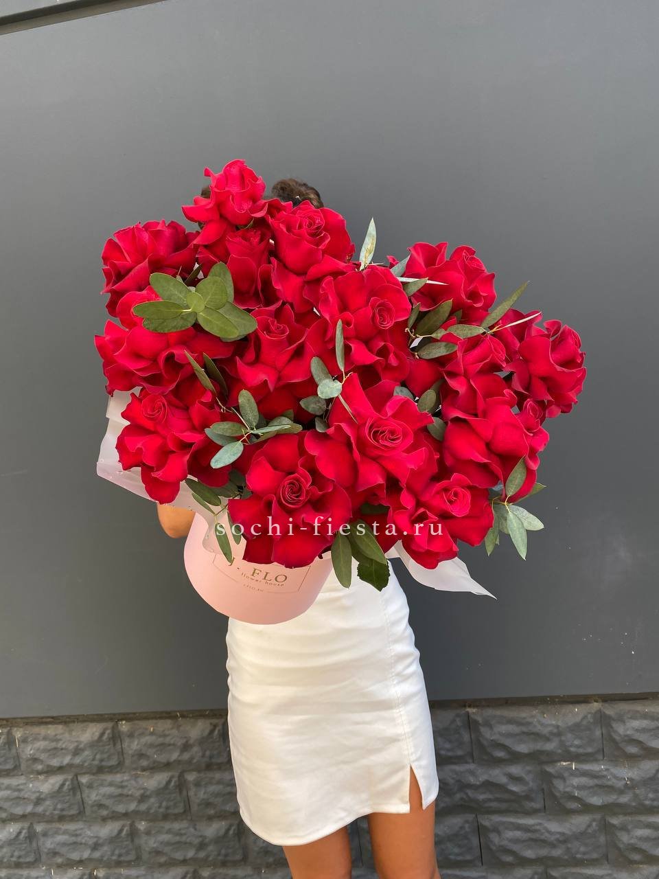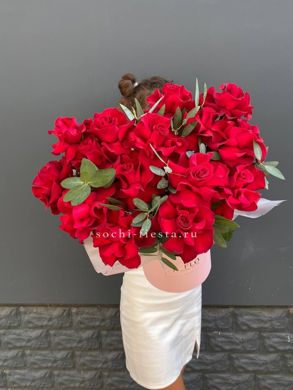 розы, диантусы, пионовидные кустовые розы, гортензия, эвкалипт, вспомогательная зелень, лента, дизайнерская упаковка.