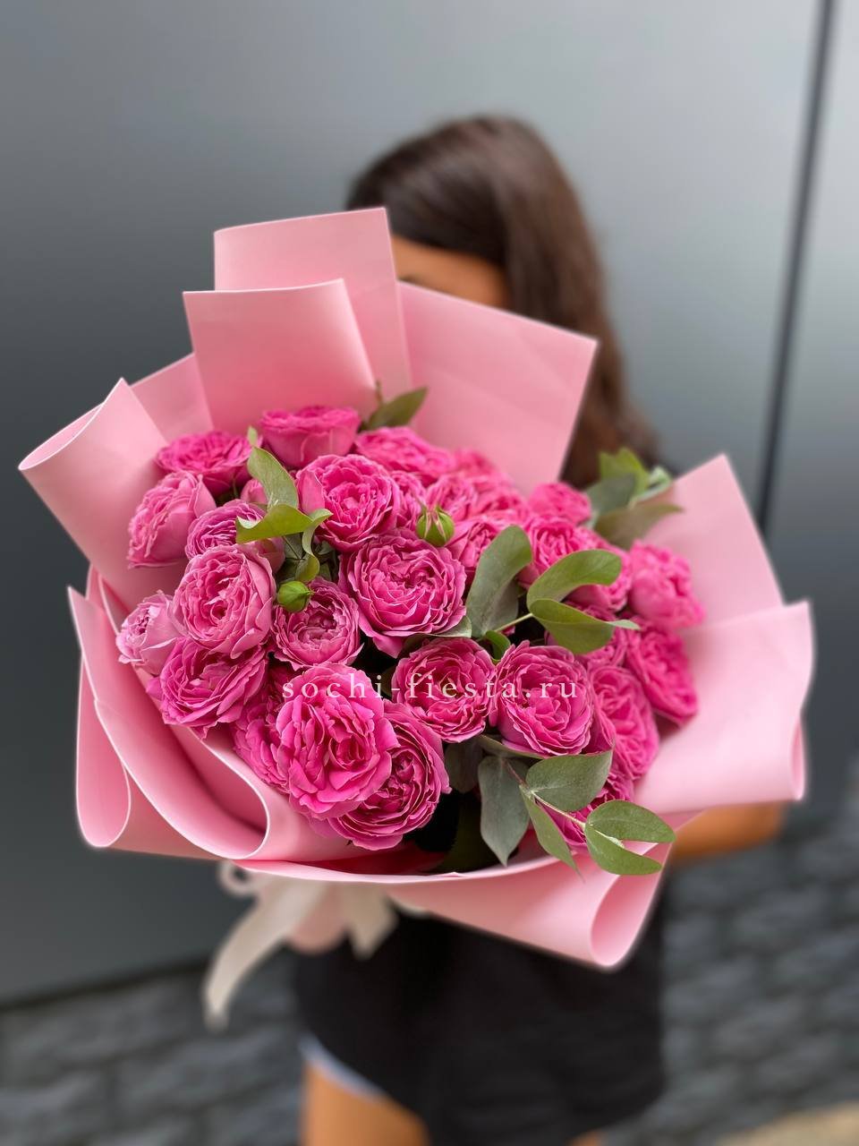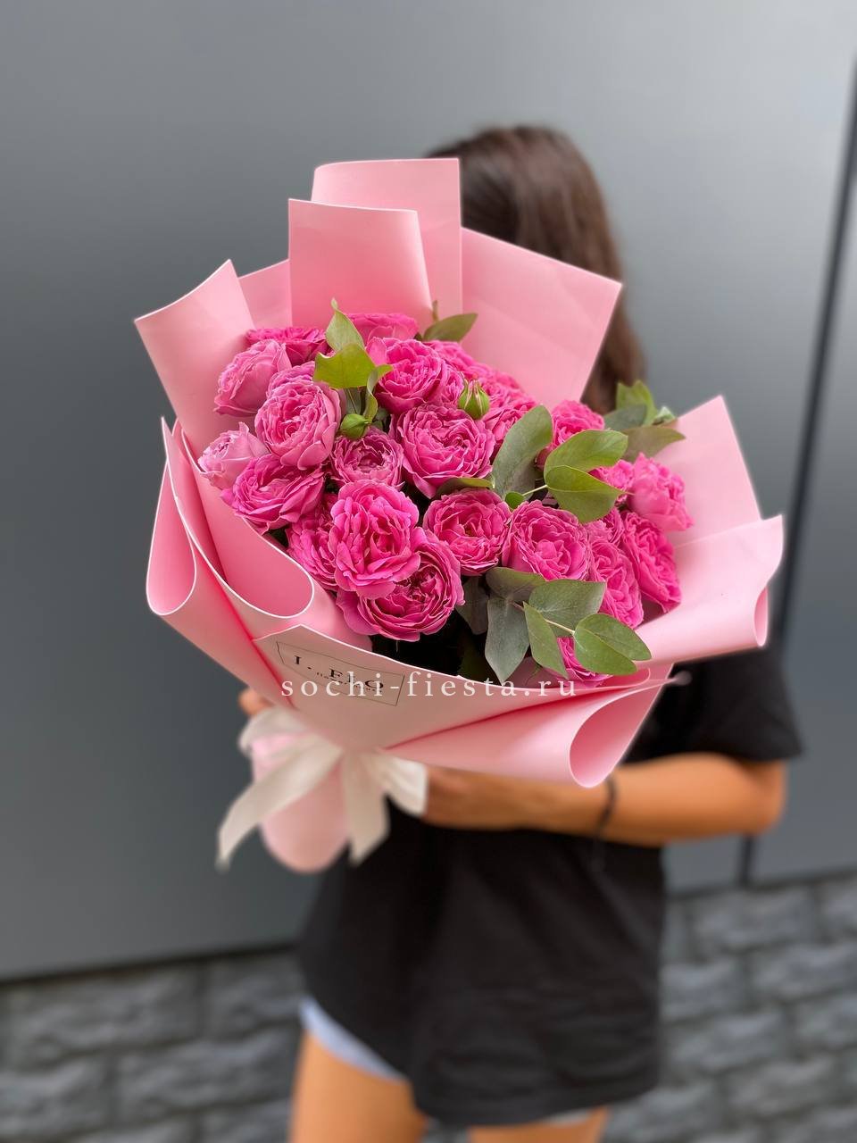 Пять кустовых роз Мисти Бабблс раскрываются пышными головками с волнистыми лепестками. Эвкалипт добавляет свежести и объема. Композиция помещена в удобную сумочку.