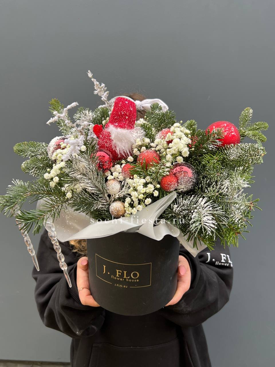 датский нобилис,  гипсофилы, красные игрушки, гном, шары, аспарагус (или аналог), сосульки ВНИМАНИЕ! Готовая композиция (декор) может иметь незначительные внешние отличия от примера на фотографии.