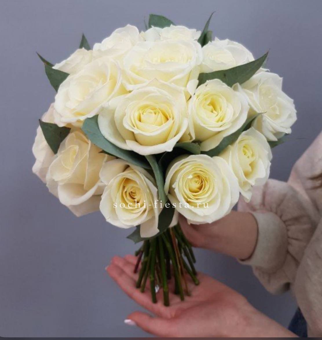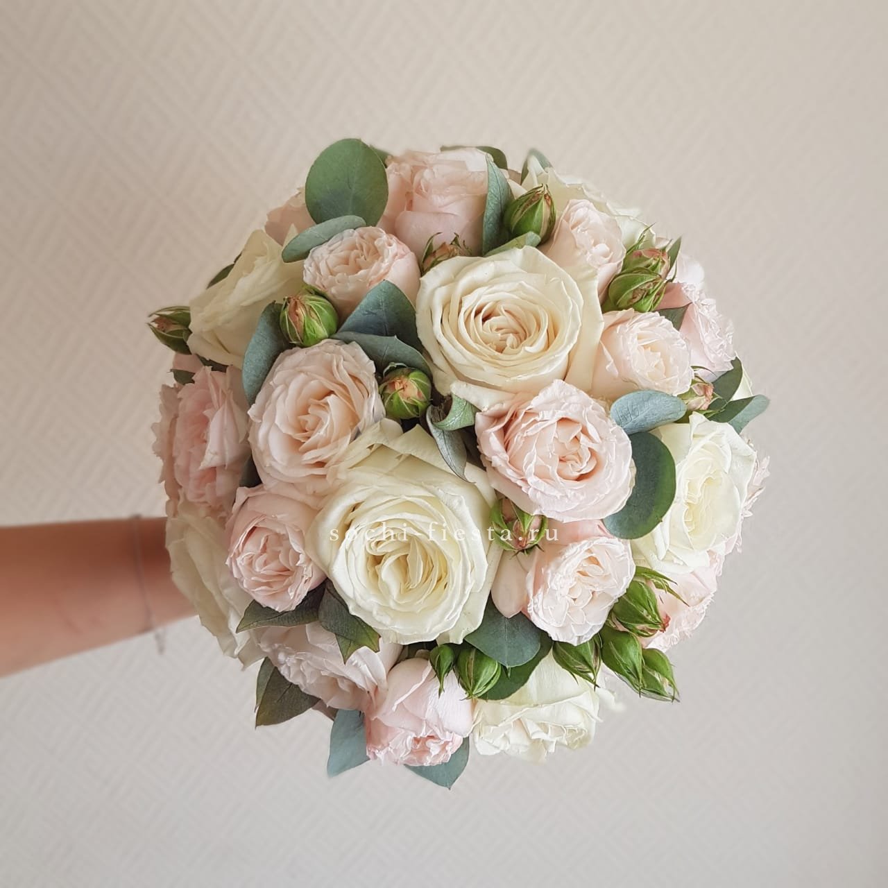 Свадебная композиция из роз эустомы и сезонных акцентов держит форму и остается свежей долгое время. Эвкалипт завершает структуру букета добавляя практичности торжественному образу.
