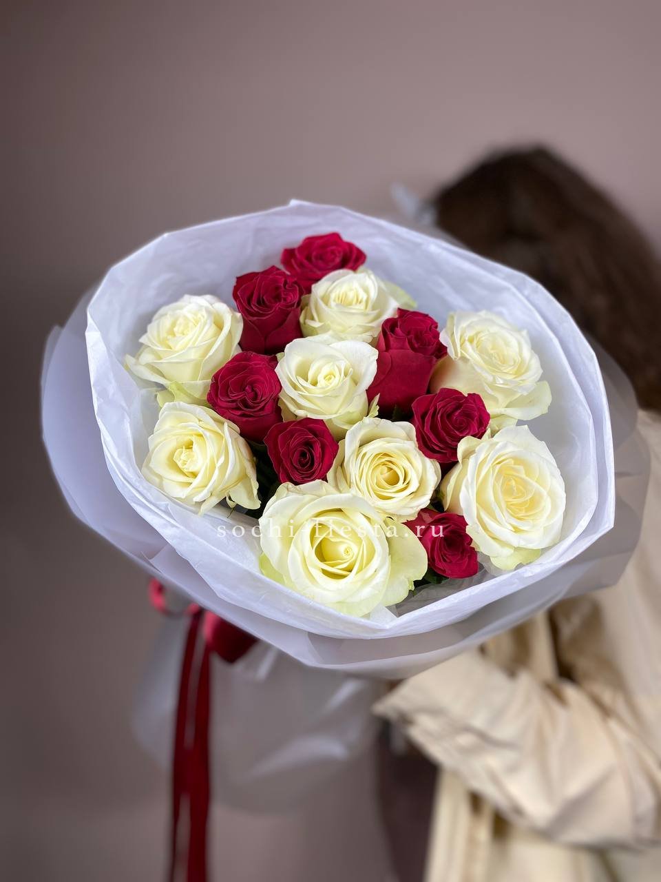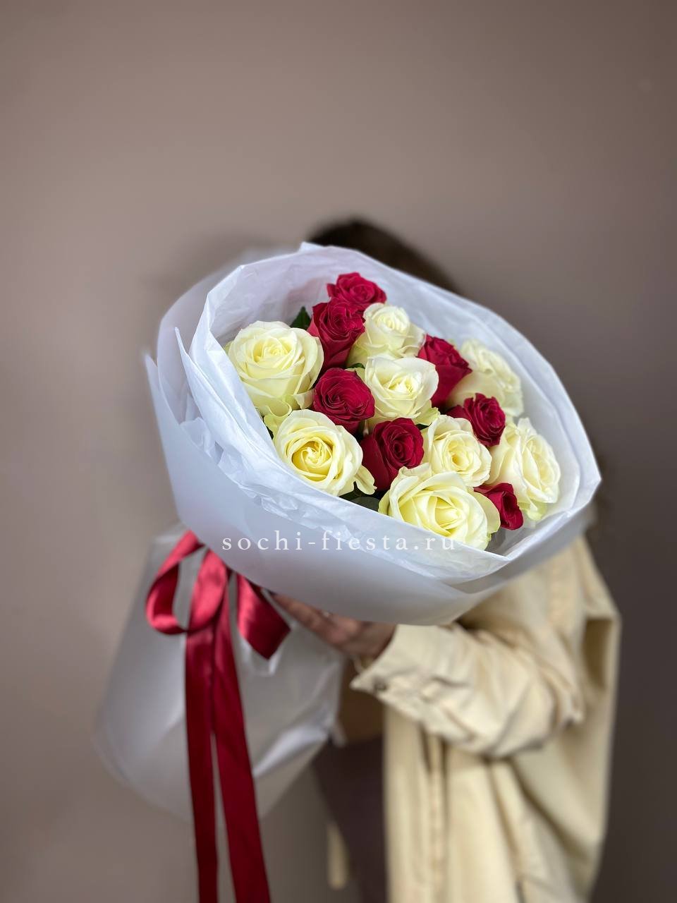 Пятнадцать роз в красно-белом исполнении собраны аккуратно и компактно. Такая композиция удобна для размещения на столе и не требует высоких ваз.