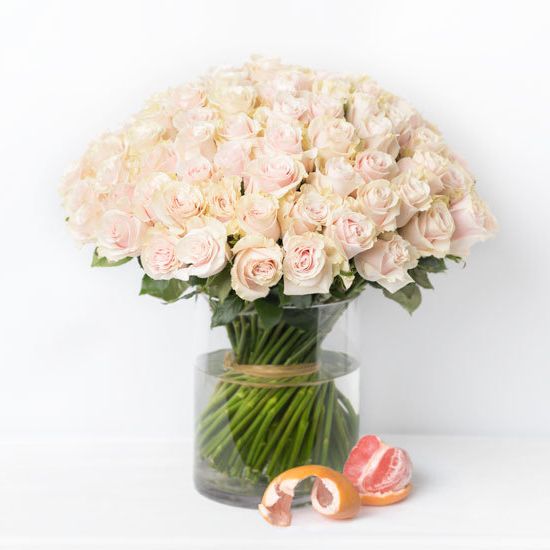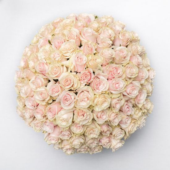 Сто одна белая роза собрана в впечатляющую охапку. Монохромная гамма и повторяющийся ритм бутонов создают мощное визуальное присутствие. Такой объём заполняет пространство и приковывает внимание.