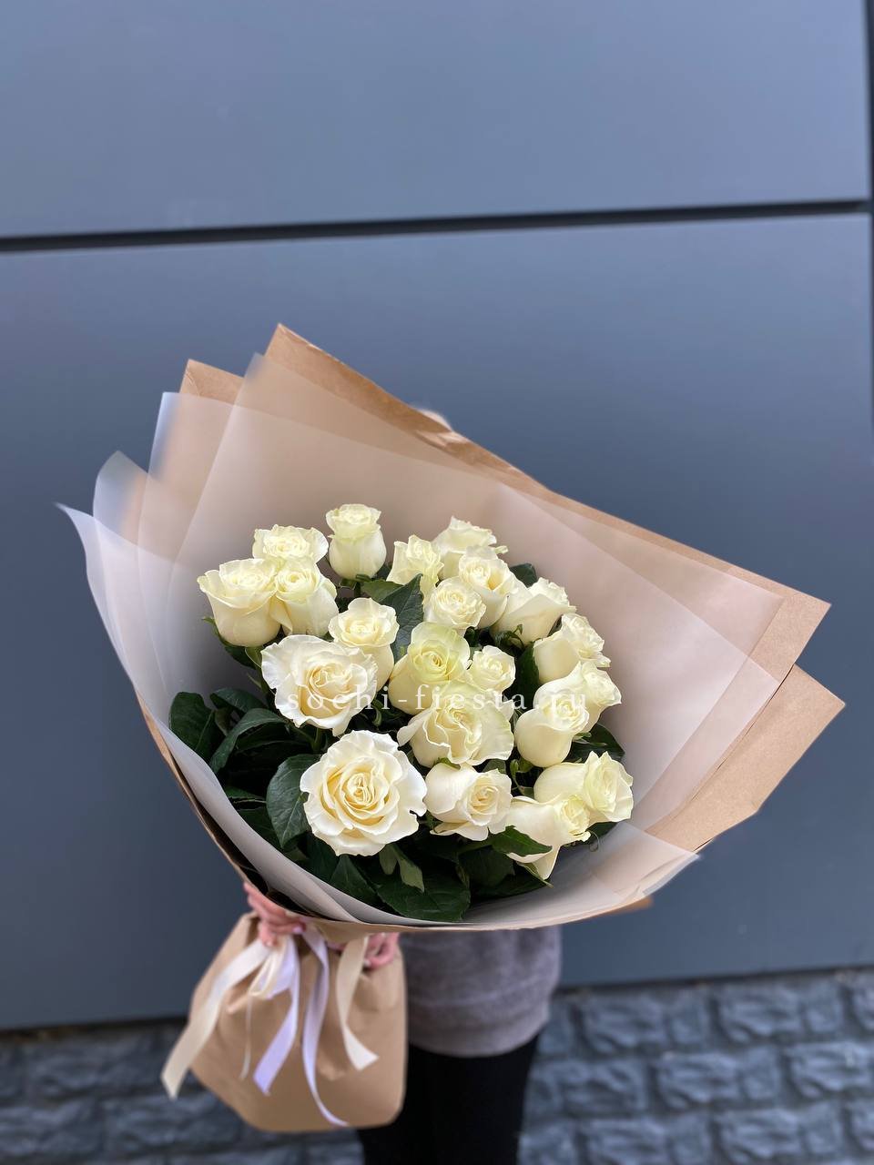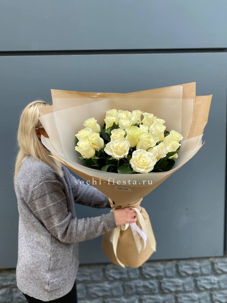 Пятнадцать белых роз в упаковке кофейного оттенка создают спокойное сочетание света и теплой глубины. Лаконичная форма букета удобна для вручения и дальнейшего размещения.