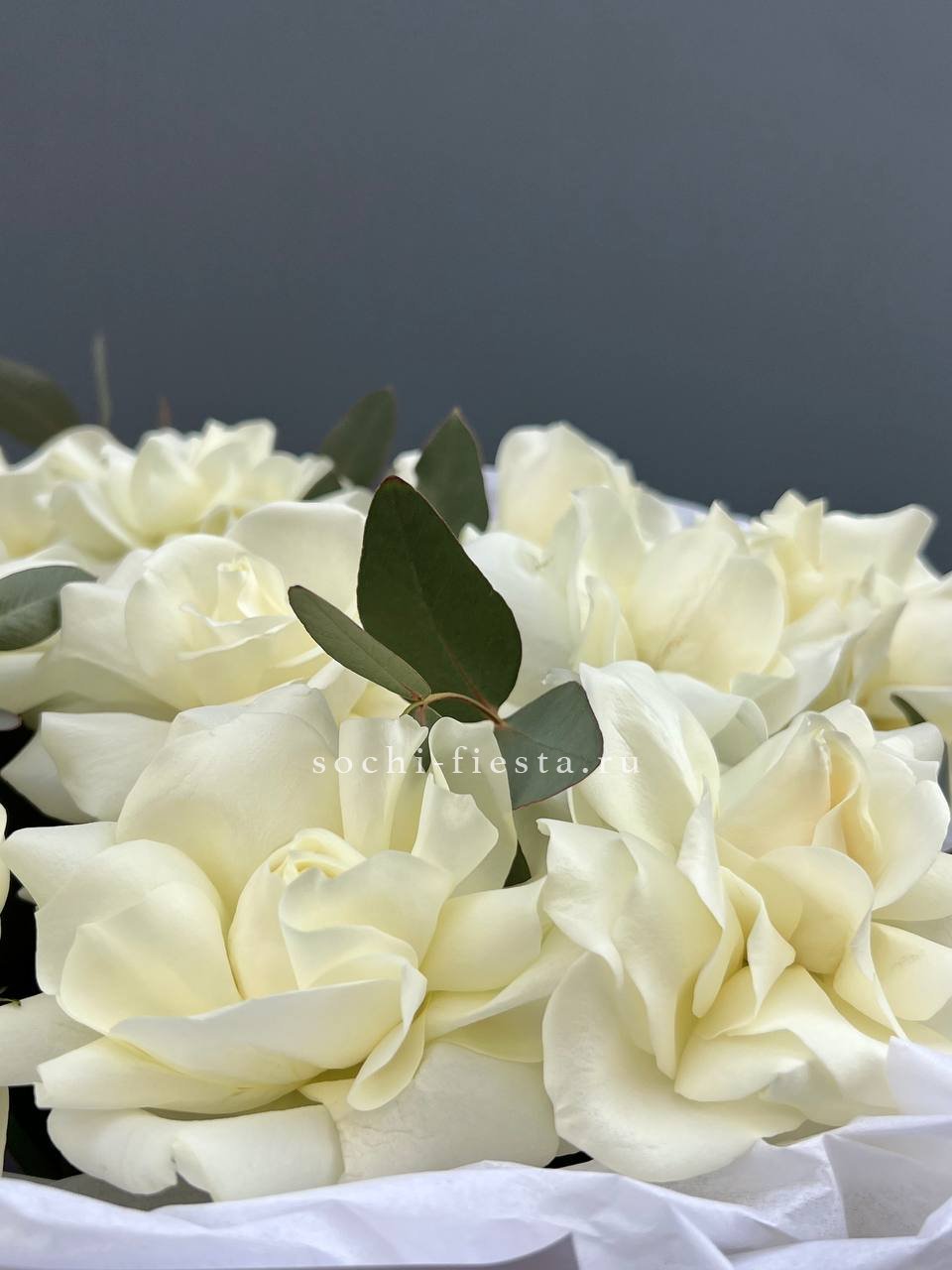 Двадцать пять белых роз образуют объёмную композицию с выразительным силуэтом. Плотная сборка и ритмичное расположение бутонов создают графичное впечатление.