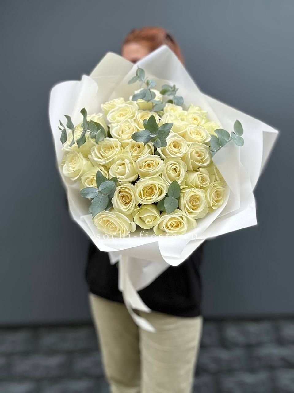 Тридцать один белоснежный бутон собран в плотную округлую форму и дополнен серебристыми ветками эвкалипта. Белый крафт сохраняет природную графику композиции и подчёркивает её объём.