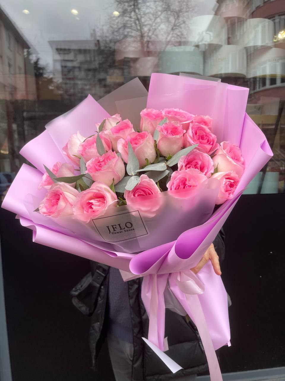 розовые розы, эвкалипт, пленка.