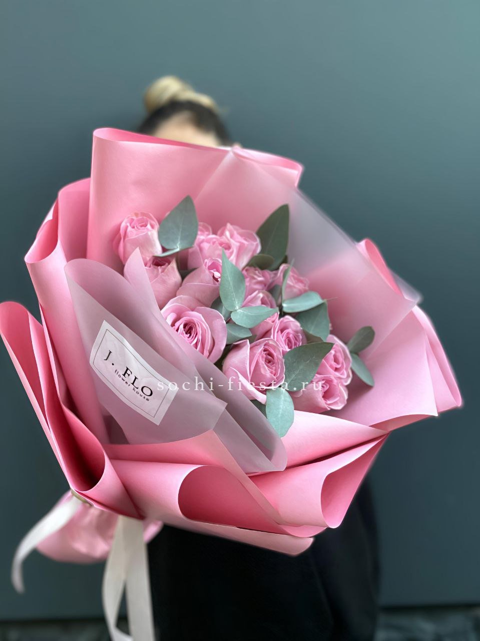 Двадцать одна роза в оригинальной упаковке с игривыми ушками создает настроение легкости и свежести. Розовые бутоны собраны в аккуратную композицию, которая удерживает форму и выглядит выразительно в любом интерьере.