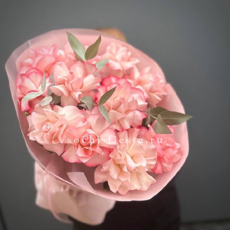 Французские розы Wendi с их фирменным пудровым оттенком раскрываются плавно и объемно. Эвкалипт добавляет воздуха между бутонами и создает естественную глубину композиции.