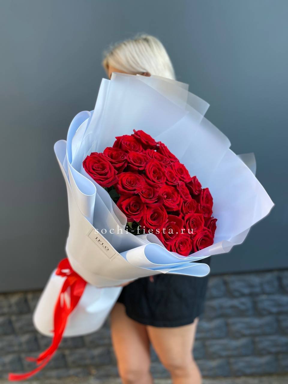 Двадцать пять бутонов выстраиваются в пышную композицию с чётким ритмом и объёмным силуэтом. Голландские розы создают впечатление монументальности и уверенной подачи.