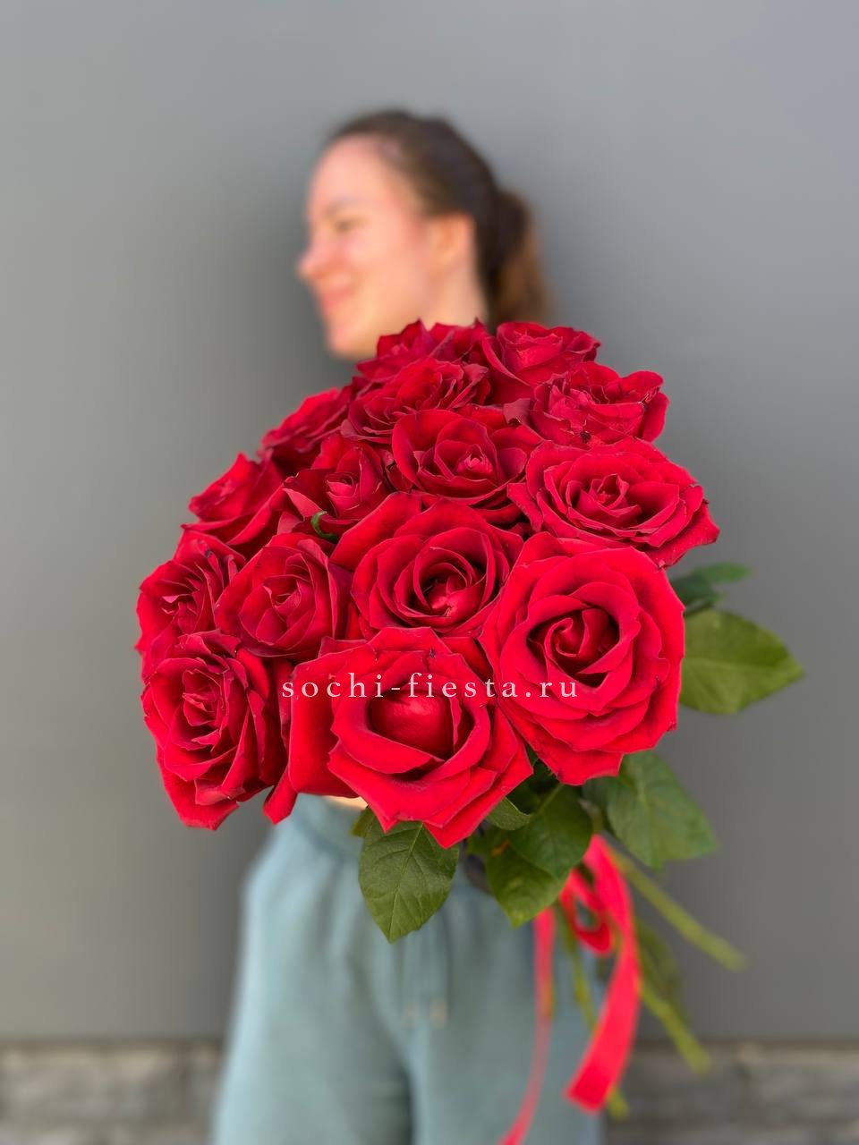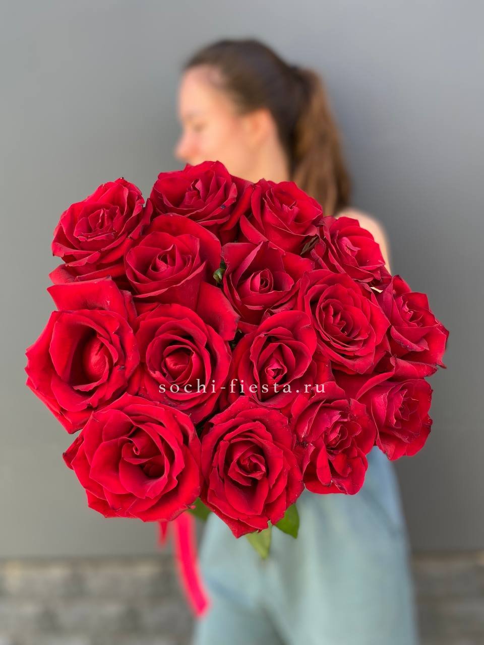 Пятнадцать розовых роз с длинными стеблями образуют воздушную композицию. Бутоны раскрыты неравномерно, что добавляет букету живую динамику и объём.