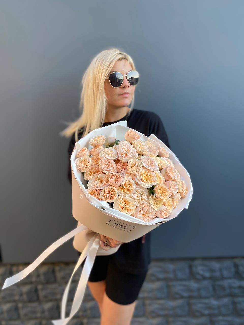 кустовая пионовидная роза, лента, дизайнерская упаковка.