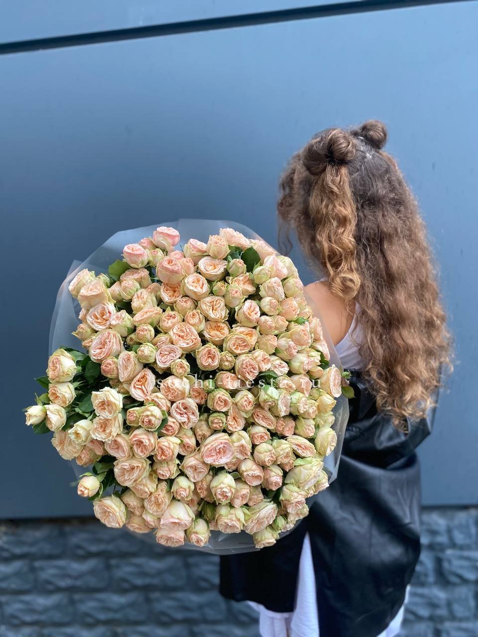 Пятьдесят один бутон образует масштабную композицию, которая притягивает внимание и заполняет пространство. Пионовидные розы создают впечатление цветочного облака с мягкими переливами оттенков.