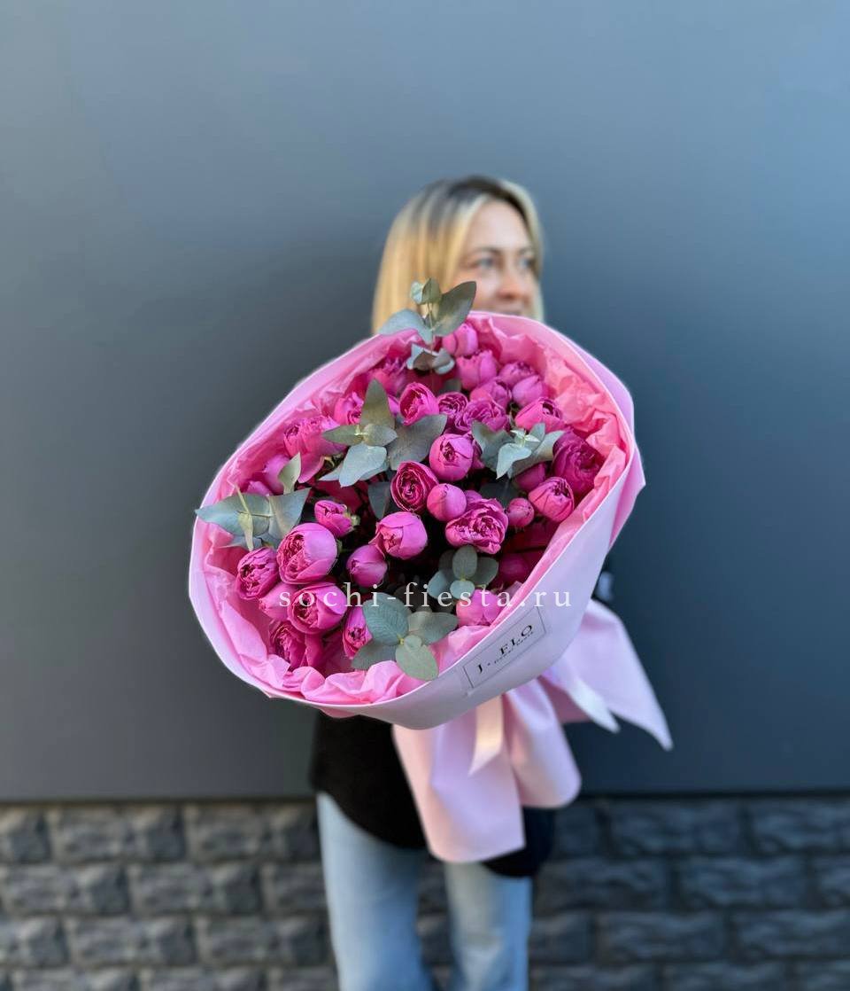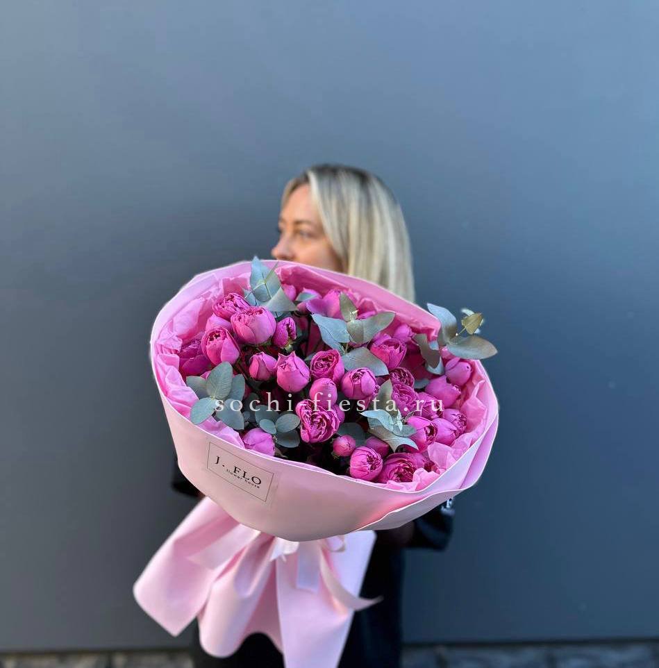 Серебристый эвкалипт обрамляет девятнадцать роз с сиреневым румянцем на лепестках. Букет выглядит современно и легко вписывается в любое пространство