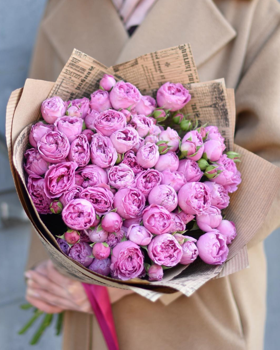 9 пионовидных роз Мисти Бабблс, эвкалипт, зелень, дизайнерская упаковка, лента.