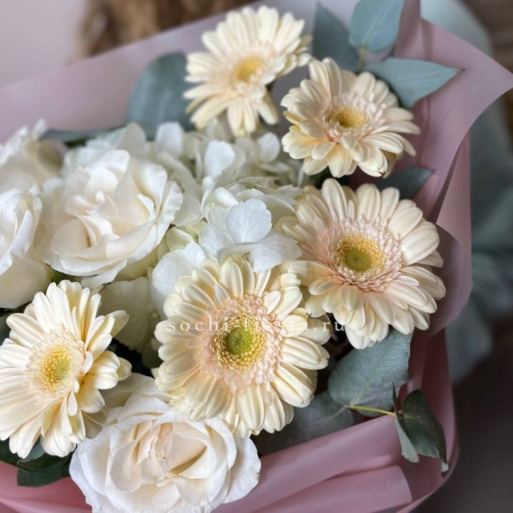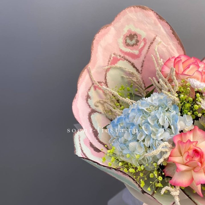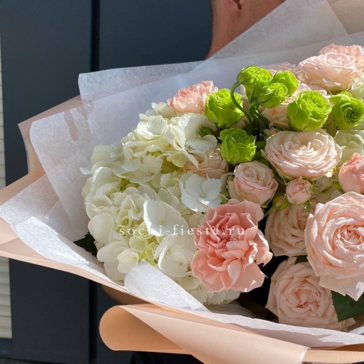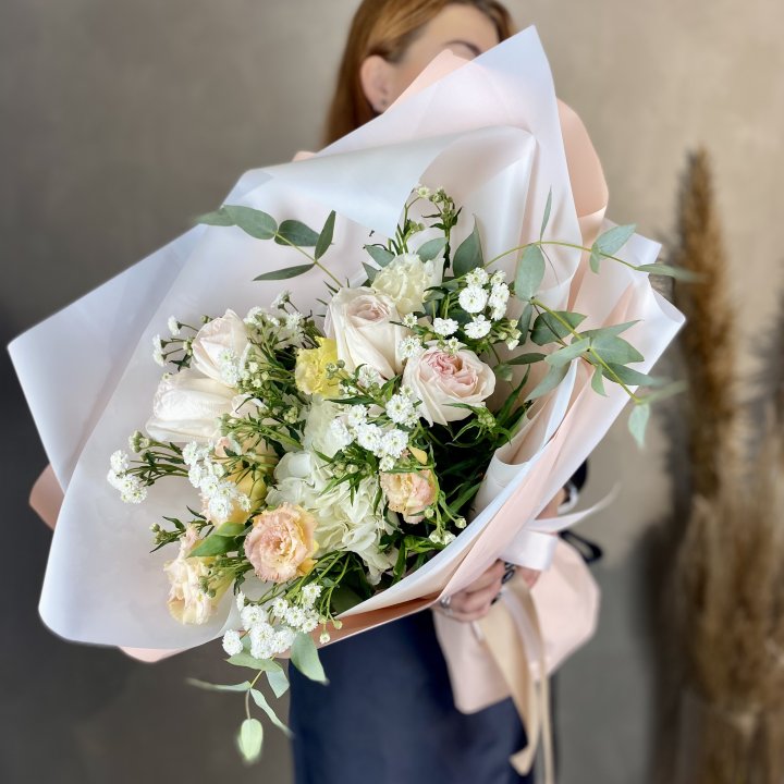 Зима и лето в Мурманске — розы и хризантемы как основа. Эти виды стабильны в поставках круглый год. Флорист дополняет их сезонными акцентами: хвойные ветви зимой, открытая эустома летом. Сборный букет в любое время года выглядит живым и актуальным.