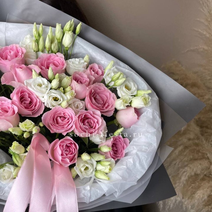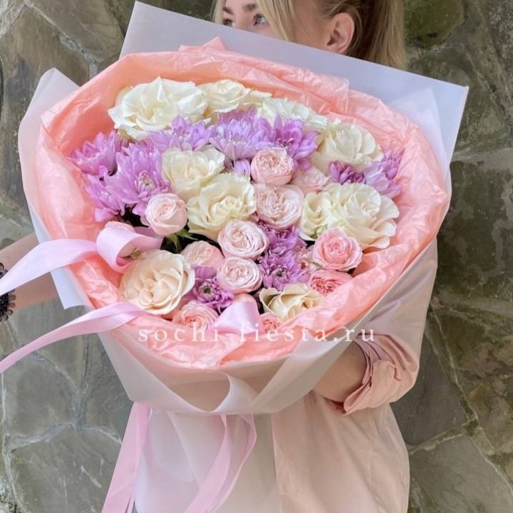 Основа сборных букетов в Мурманске: розы (Freedom, Mondial, Avalanche), хризантема кустовая, альстромерия, эустома, фрезия, вероника. Дополнительно — ранункулюсы в сезон, хризантема одиночная, ирис весной, тюльпаны в апреле. Состав зависит от текущей поставки и сезона. Флорист всегда предлагает то, что в лучшей форме прямо сейчас.