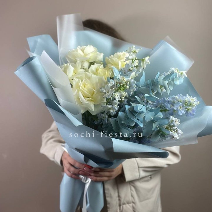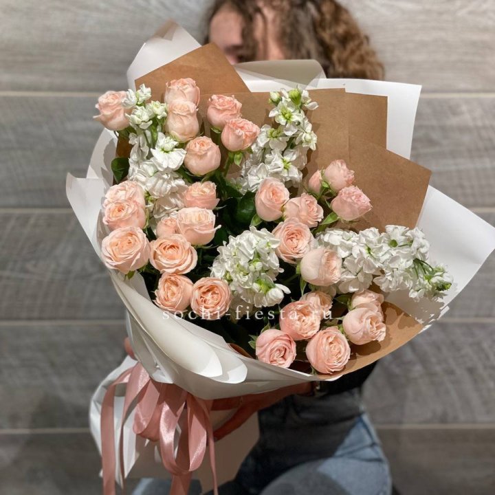 Основа сборных букетов в Мурманске: розы (Freedom, Mondial, Avalanche), хризантема кустовая, альстромерия, эустома, фрезия, вероника. Дополнительно — ранункулюсы в сезон, хризантема одиночная, ирис весной, тюльпаны в апреле. Состав зависит от текущей поставки и сезона. Флорист всегда предлагает то, что в лучшей форме прямо сейчас.