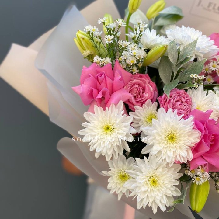 Зима и лето в Мурманске — розы и хризантемы как основа. Эти виды стабильны в поставках круглый год. Флорист дополняет их сезонными акцентами: хвойные ветви зимой, открытая эустома летом. Сборный букет в любое время года выглядит живым и актуальным.