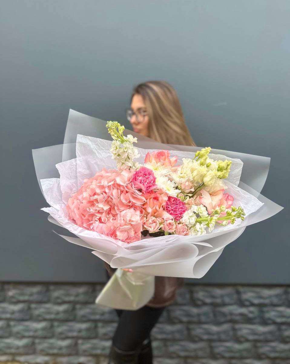 маттиола, розы, гортензия, диантусы, хризантемы , лента и дизайнерская пленка.