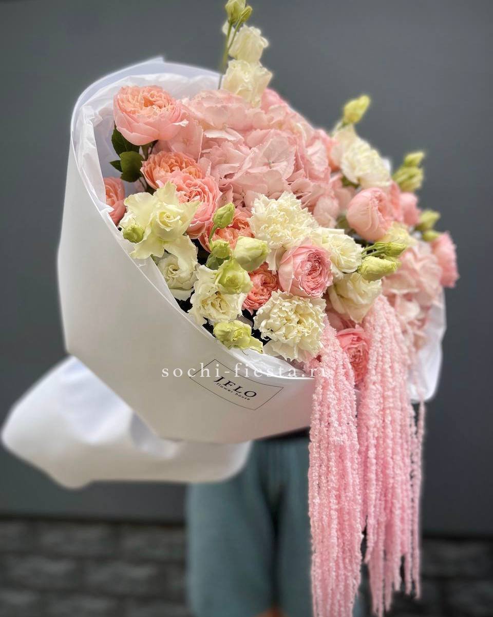 кустовые розы, гортензии, диантусы, эустома, амарант, лента и дизайнерская пленка.