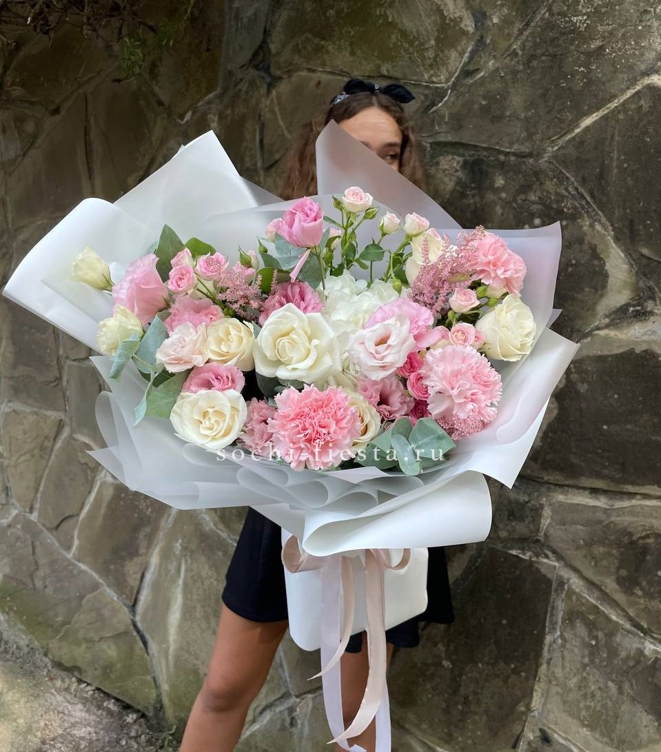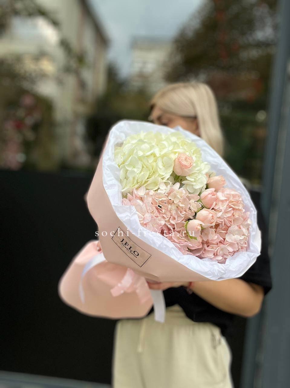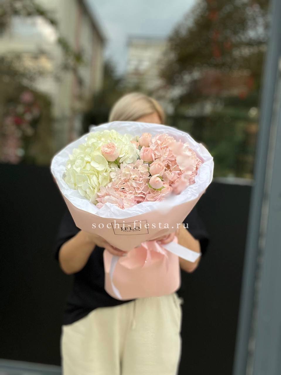 Плотная сборка с пышными соцветиями гортензии и яркими герберами создает объемный силуэт. Маттиола и лимониум добавляют воздушности по краям, а диантусы заполняют центр мягкими переходами.