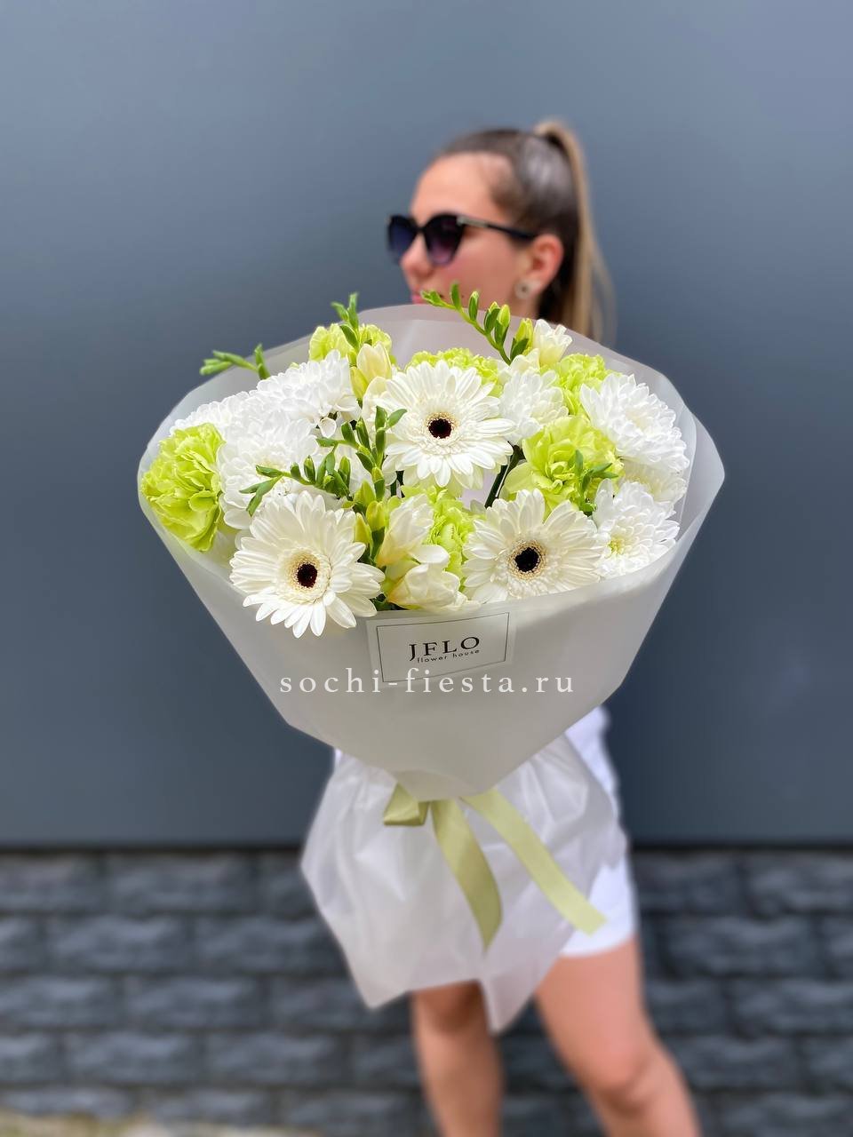 гортензия, герберы,  фрезии, диантусы, хризантемы , лента и дизайнерская пленка.