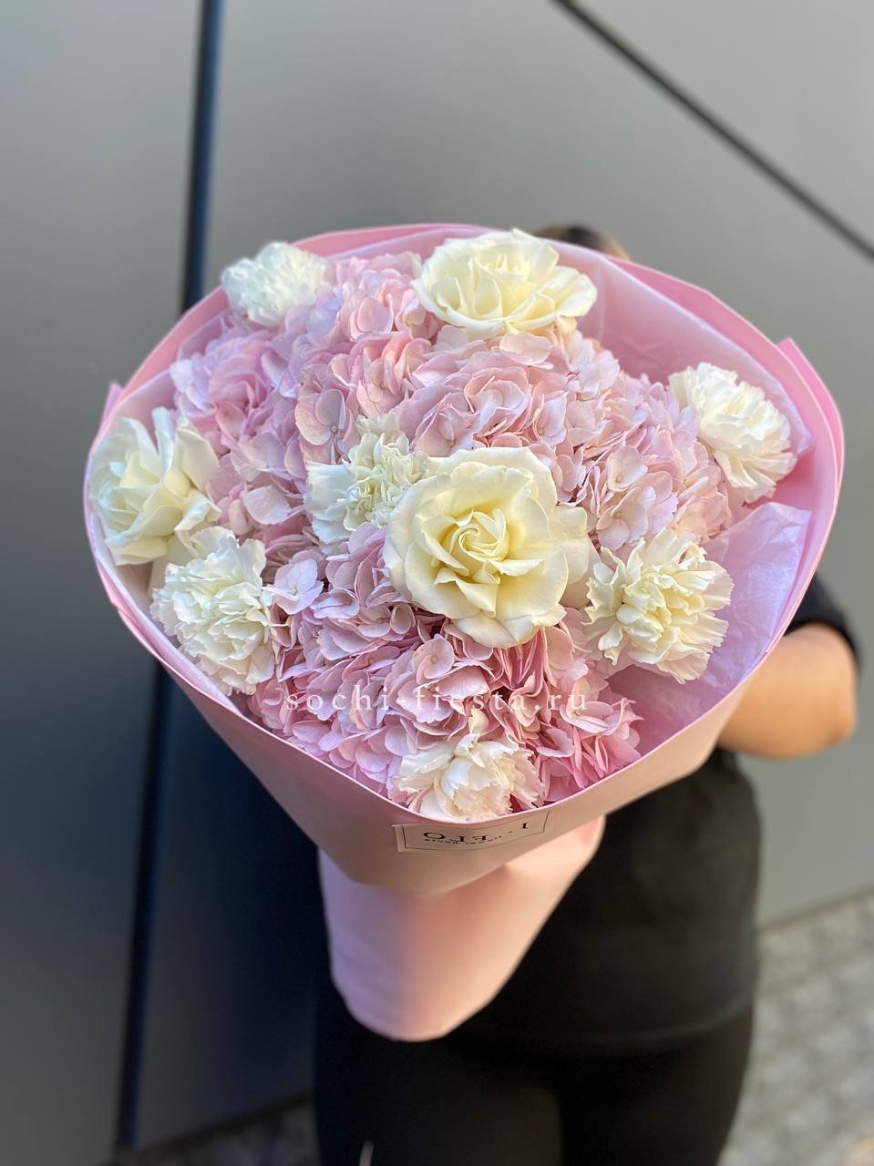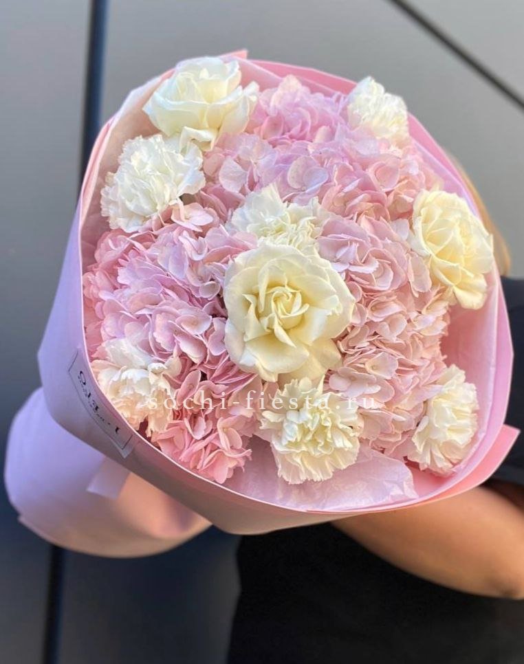 гортензия, роза белая, диантус лента, дизайнерская пленка.
