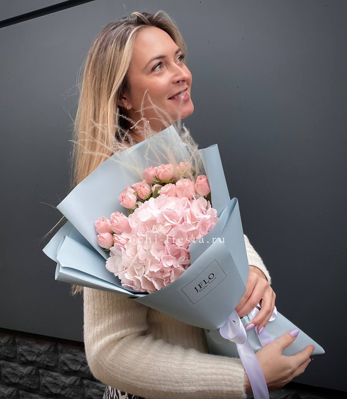 Пышные шапки гортензии создают воздушный объём, а белые розы добавляют графичности. Букет держит форму и легко размещается в любом пространстве.