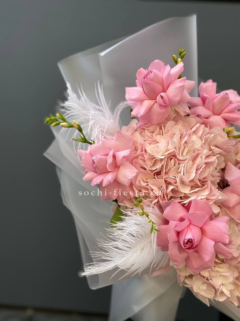 Пышные шапки гортензий создают воздушную основу, сквозь которую проступают розовые бутоны. Перья добавляют графичности и лёгкости всему силуэту.