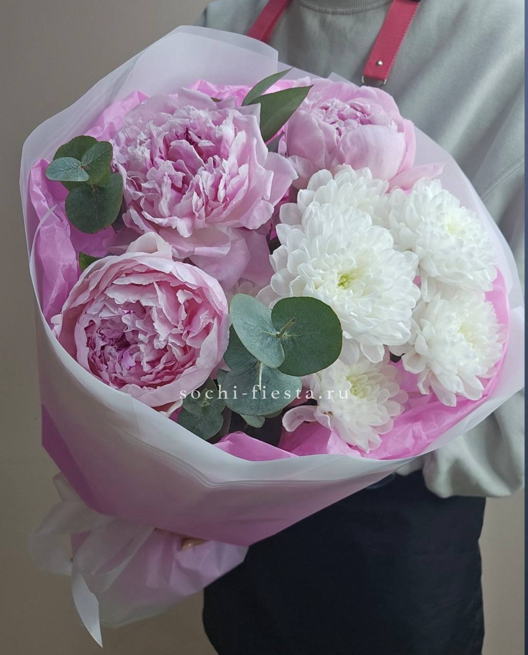 пионы, хризантема, эвкалипт, матовая пленка и тишью.