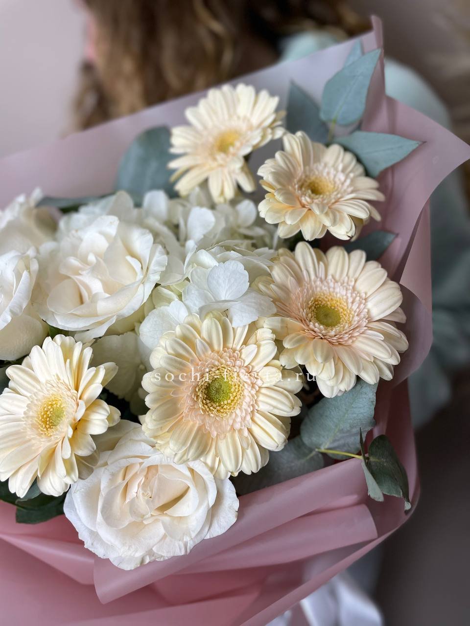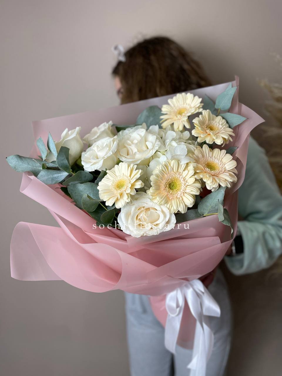 Воздушные соцветия лагуруса создают мягкую дымку вокруг роз и хризантем. Букет собран с ощущением лёгкости и простора, словно морской бриз коснулся каждого лепестка.