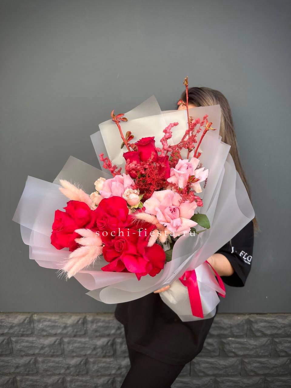 Красные и розовые оттенки переплетаются с цветущими ветками и пушистым лагурусом. Аспарагус добавляет воздушности, а кустовые розы заполняют пространство живой энергией. Букет держит форму и притягивает взгляд.
