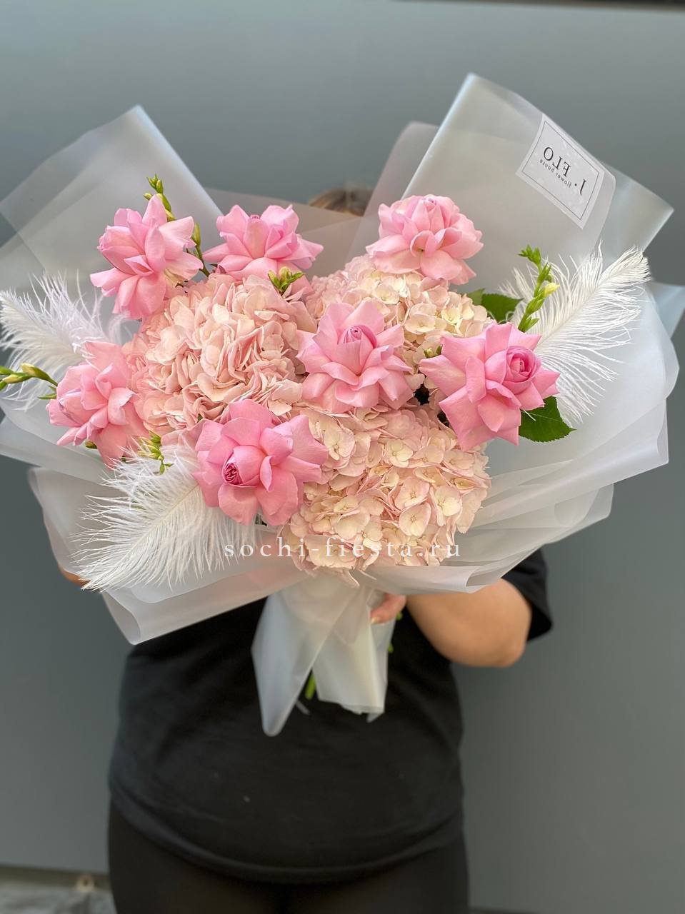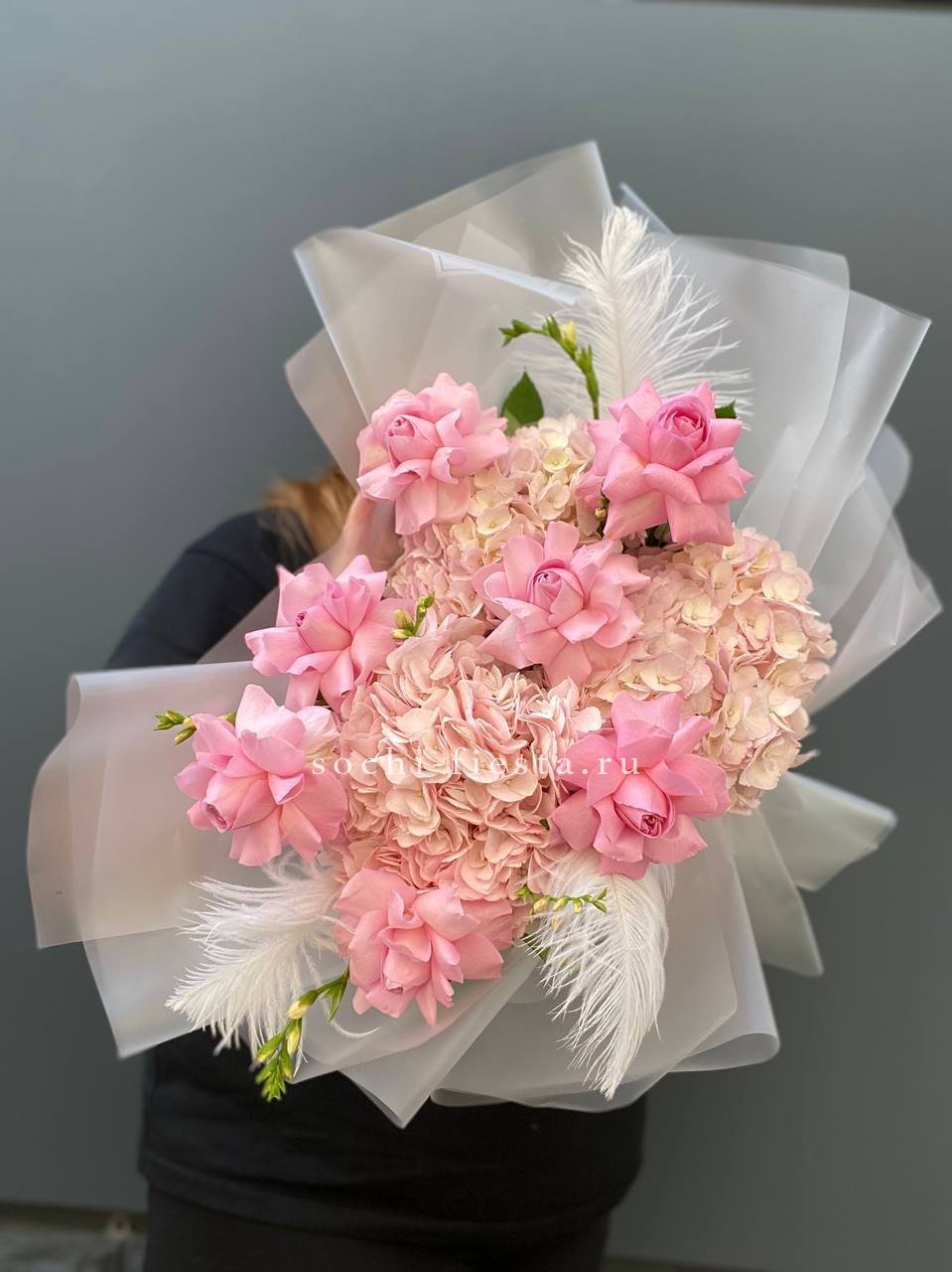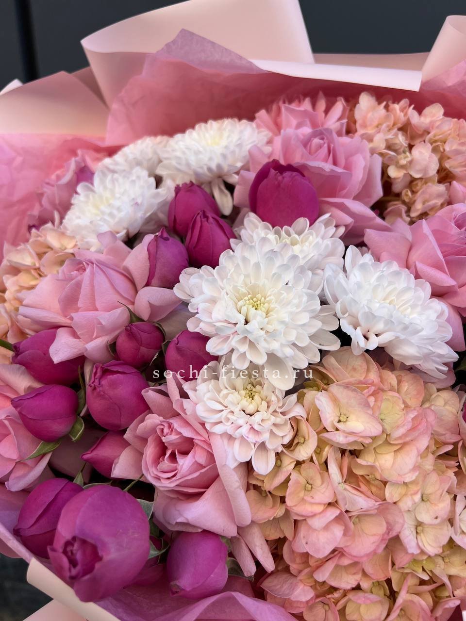 хризантема кустовая, гортензия, мисти баблс, розы в нежном оформлении.