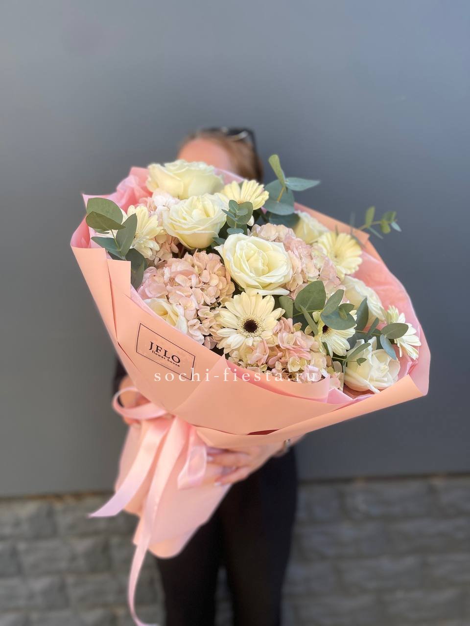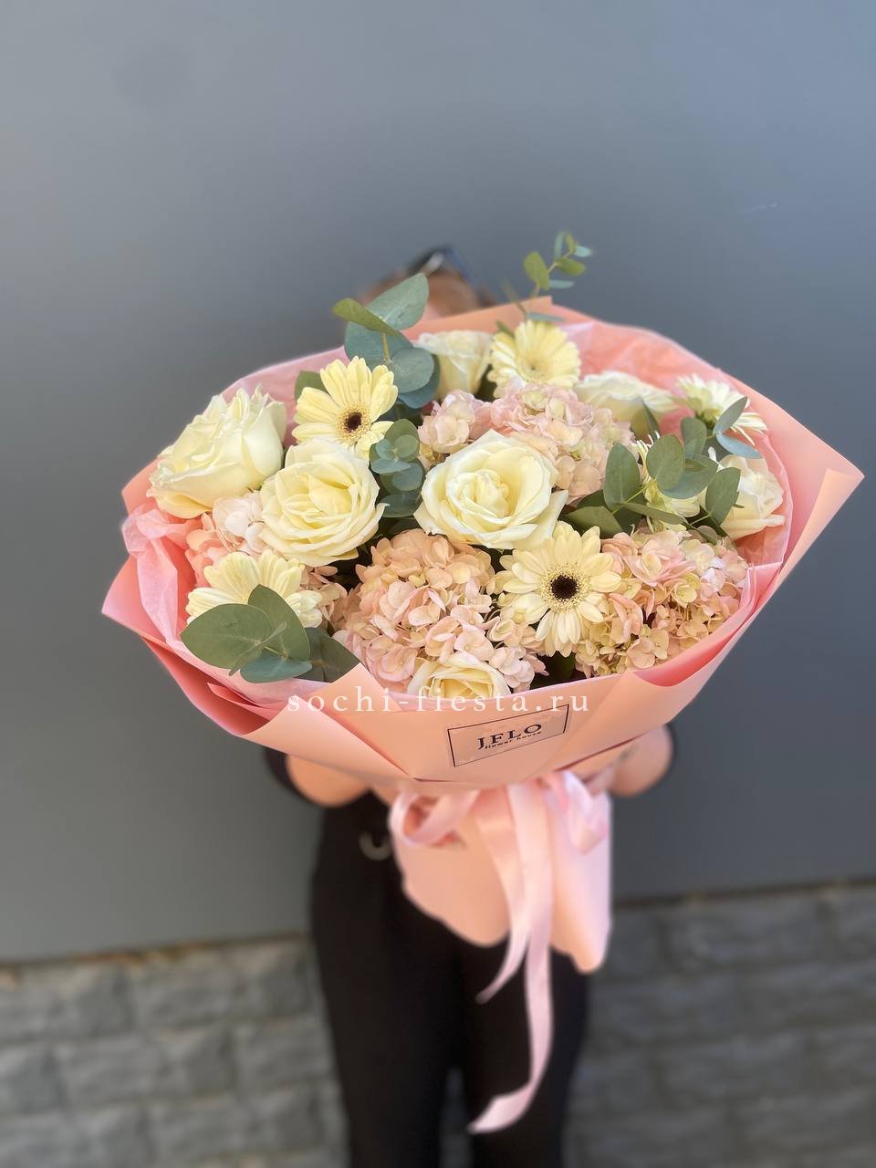 Гортензия образует пышную основу, сквозь которую проступают светлые головки эустомы и роз. Бомбастик вносит графичность, создавая объём и глубину.