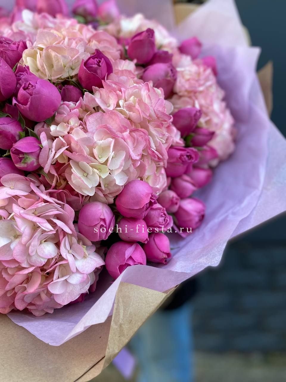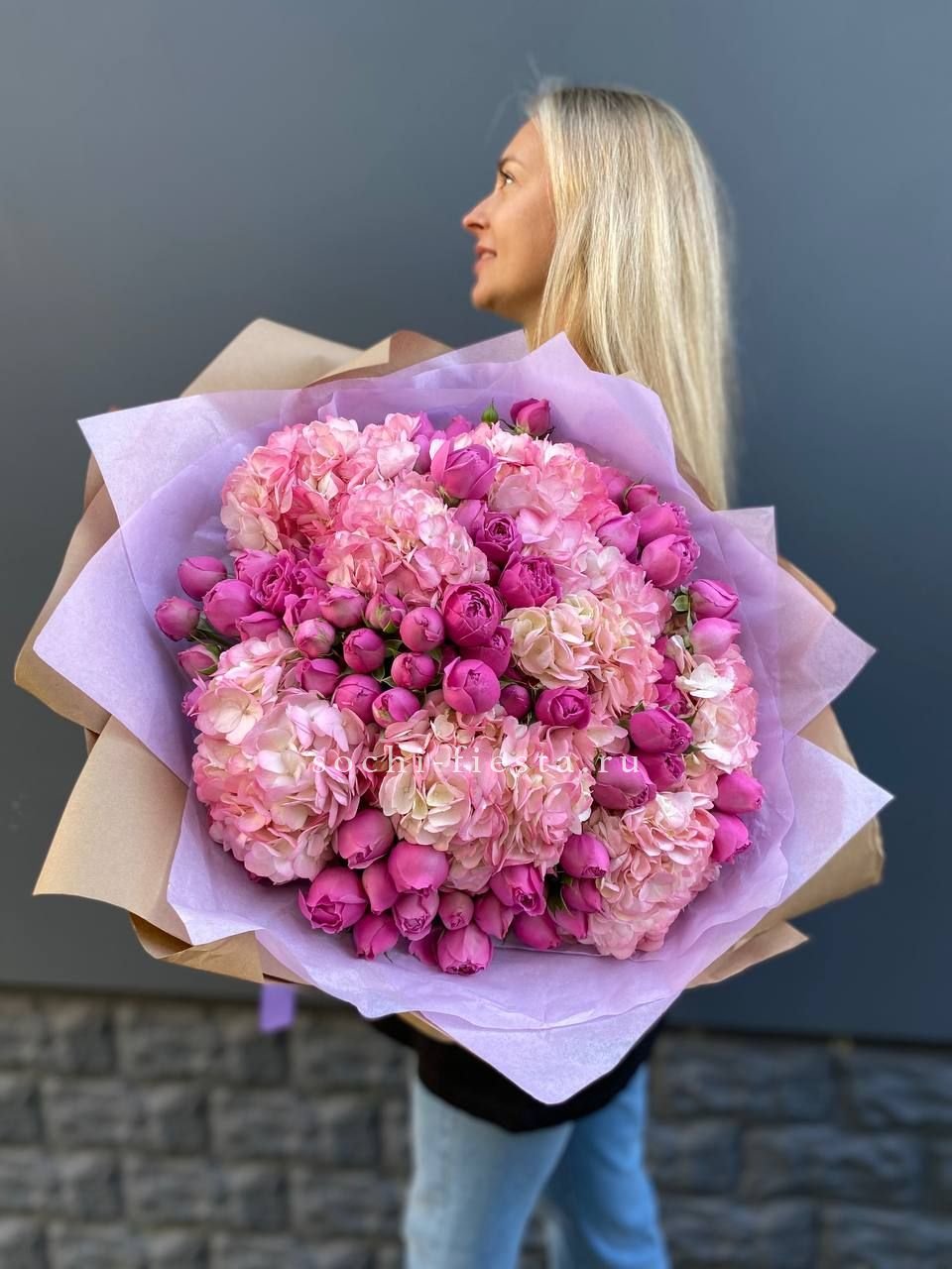 гортензия, розовые розы, кустовые розы, маттиолы,, лимониум лента и дизайнерская пленка.