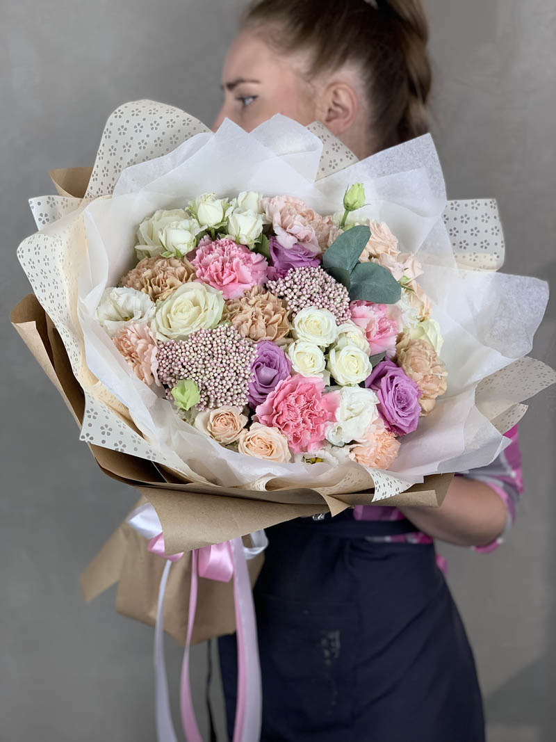 диантус, эустома, хризантема, белая роза, эвкалипт, упаковка.