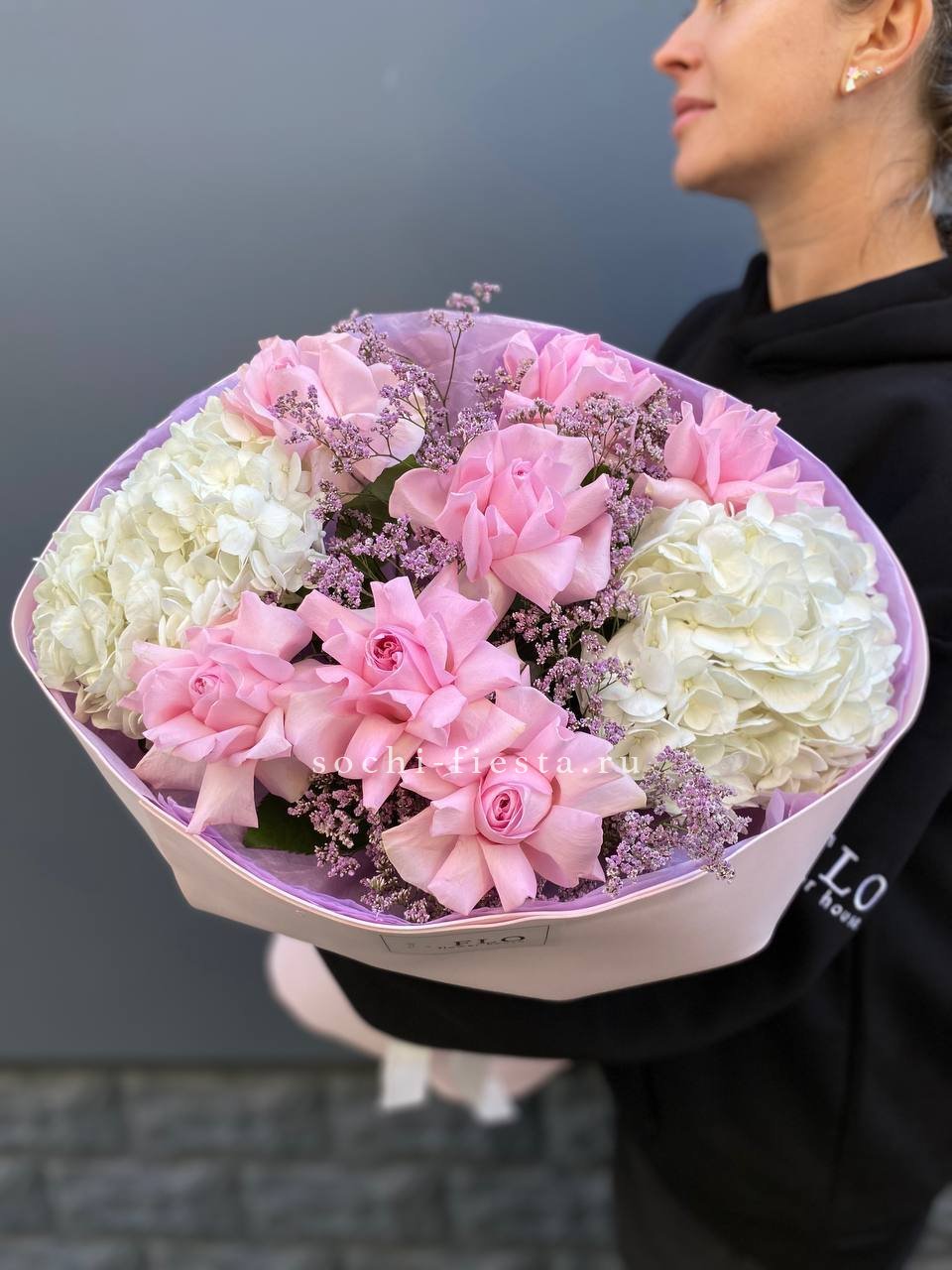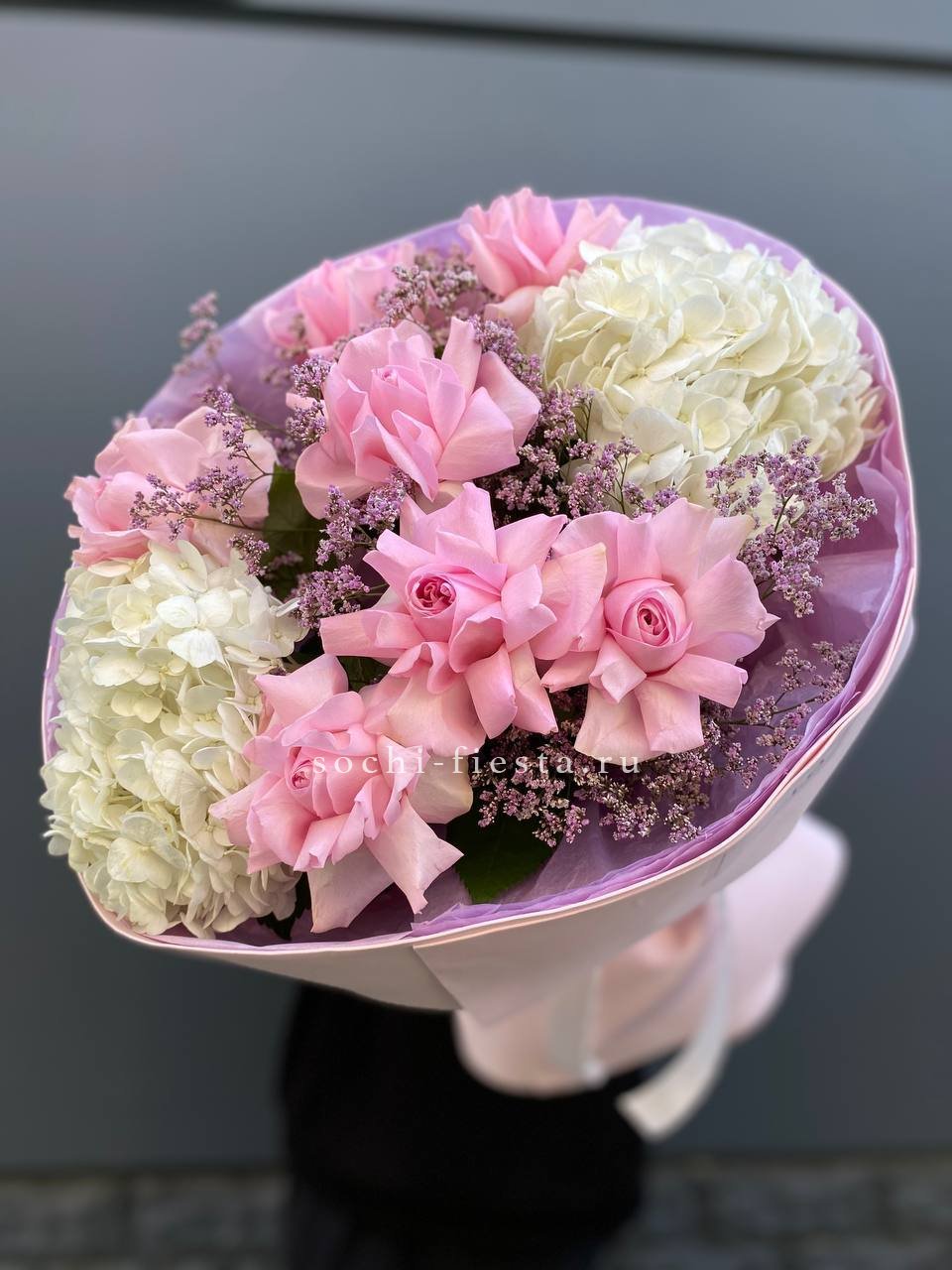гортензия, гвоздика, статица (или аналог), роза, эустома, дизайнерская пленка, лента.