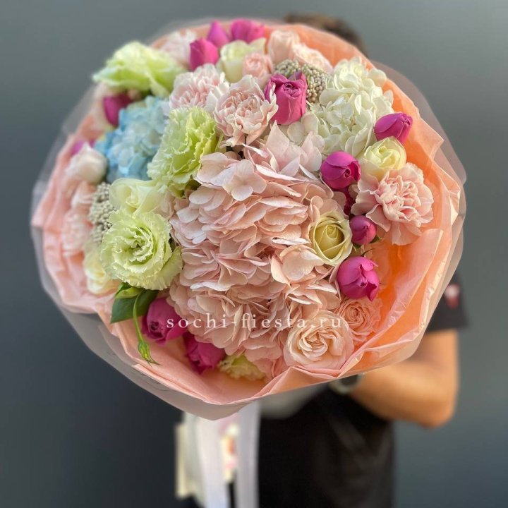 Сезонные хиты в Мурманске складываются из классической голландской и эквадорской срезки круглый год плюс сезонные акценты. Пионы в мае-июне, гортензия летом, хризантемы осенью, амариллис зимой. Местные тёплые теплицы добавляют свежие позиции в межсезонье.