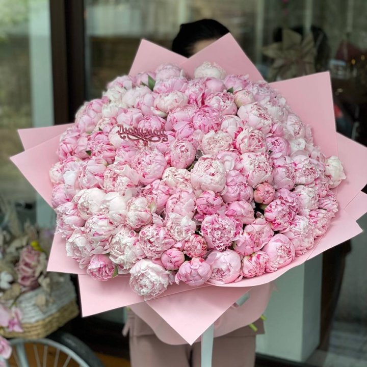 Пионы в сезон (май-июнь) — второй по популярности формат. Sarah Bernhardt, Coral Charm, Red Charm, Bowl of Cream. Моно-букет из 25 пионов или смешанная композиция с эустомой и гипсофилой.